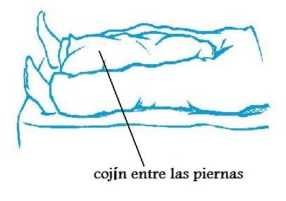 Durante las primeras semanas deberá dormir boca arriba y evitar cualquier postura de lado para evitar el riesgo de luxación. En situaciones normales, la postura de lado es la mejor para dormir, pero en este caso se debe evitar, ya que en esta posición es muy difícil controlar la pierna y es fácil que acabe cruzándola o realizando algún movimiento brusco. Se puede colocar un cojín entre las piernas como indica la imagen para evitar que las piernas se crucen.